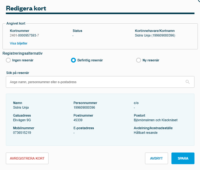 Om en redan registrerad person ska ha kortet så ska Befintlig resenär väljas.