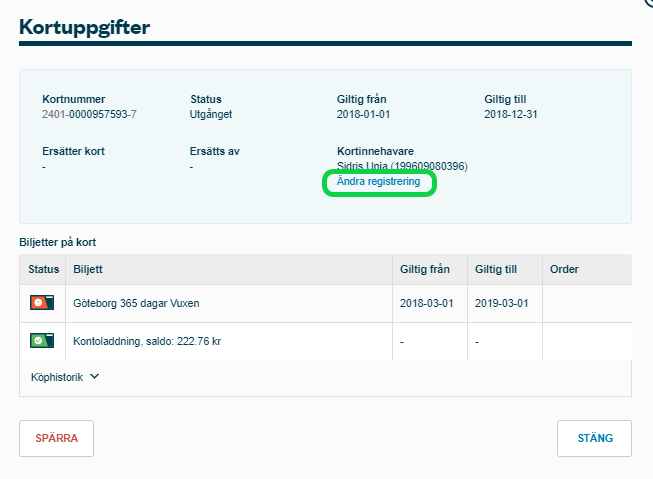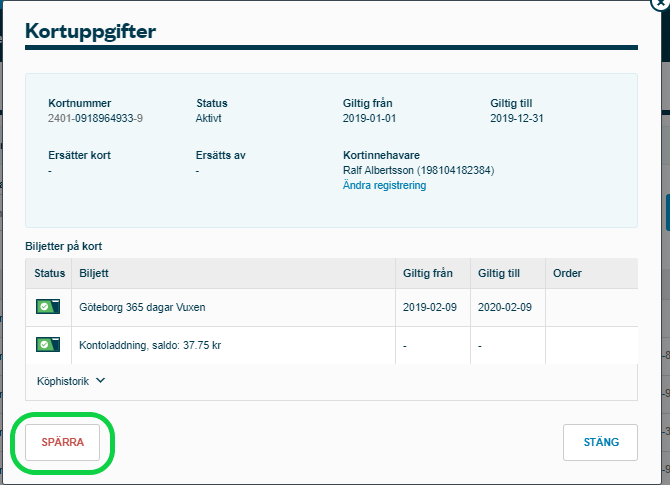 Du kan antingen söka på kortnumret genom att klicka på knappen Sök kort uppe till höger i rutan, eller gå in på fliken Biljetter och söka upp det kortet som du ska spärra. Du kan då söka på biljettyp, biljettinnehavare eller personnummer. Klicka sedan på kortnumret. Båda söksätten leder till samma fönster med kortuppgifter.