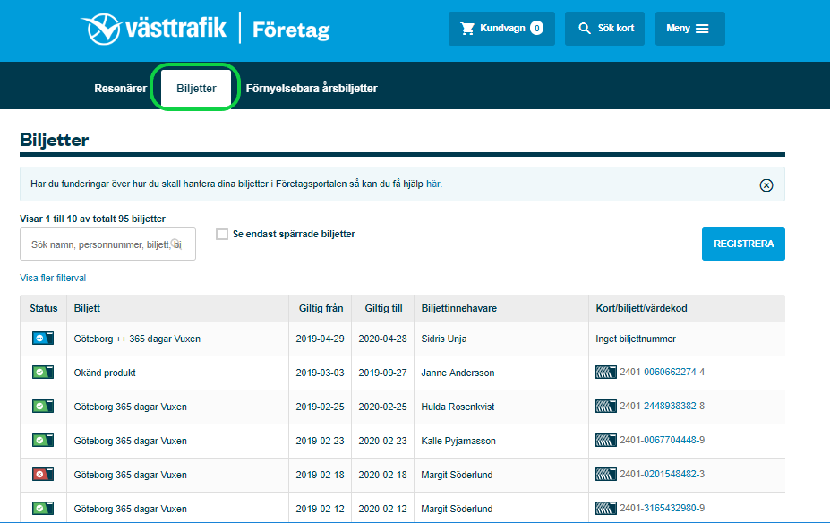 - Vi rekommenderar att du som administratör registrerar biljetterna i Företagsportalen när ni fått dem. På så sätt kan ni se vilken biljett som tillhör vem, och era medarbetare kan ersätta sin biljett om de skulle tappa bort den. Om en biljett inte är registrerad kan vi inte ersätta den vid förlust.