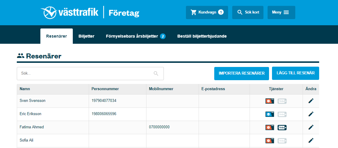 Företagsportalen har fyra flikar för att kunna administrera resenärer, kort och biljetter.