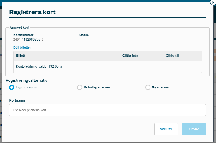 Om man till exempel vill ha ett extrakort för utlåning, kan det vara bra att inte koppla kortet till någon specifik resenär. Klicka i Ingen resenär och ge kortet ett namn. Klicka på Spara.