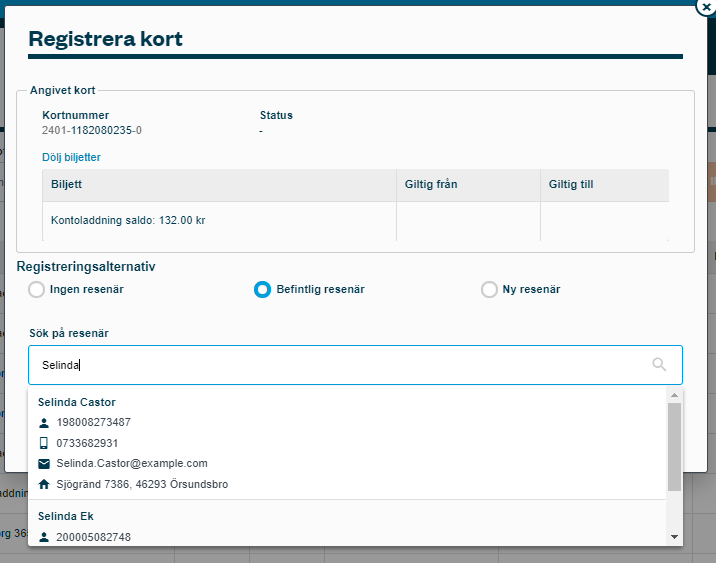 Du kan se vad som finns på kortet genom att klicka på Visa biljetter. Här kan du välja om du vill koppla det till en resenär eller inte.