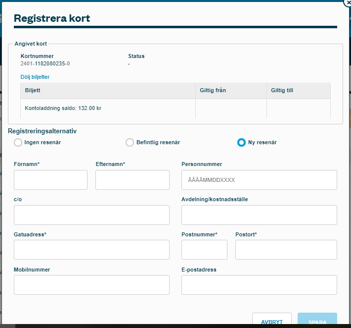 Välj Ny resenär om det är en helt ny resenär som inte finns registrerad tidigare som ska ha kortet.