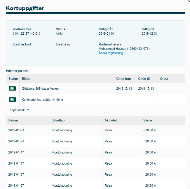 Ange kortnummer med alla siffror på kortet. Knappen Hämta kortinfo tänds när du skrivit 15 siffror och släcks om det blir för många. Klicka sedan på Hämta kortinfo. Om du skriver in ett felaktigt kortnummer får du ett meddelande om det.