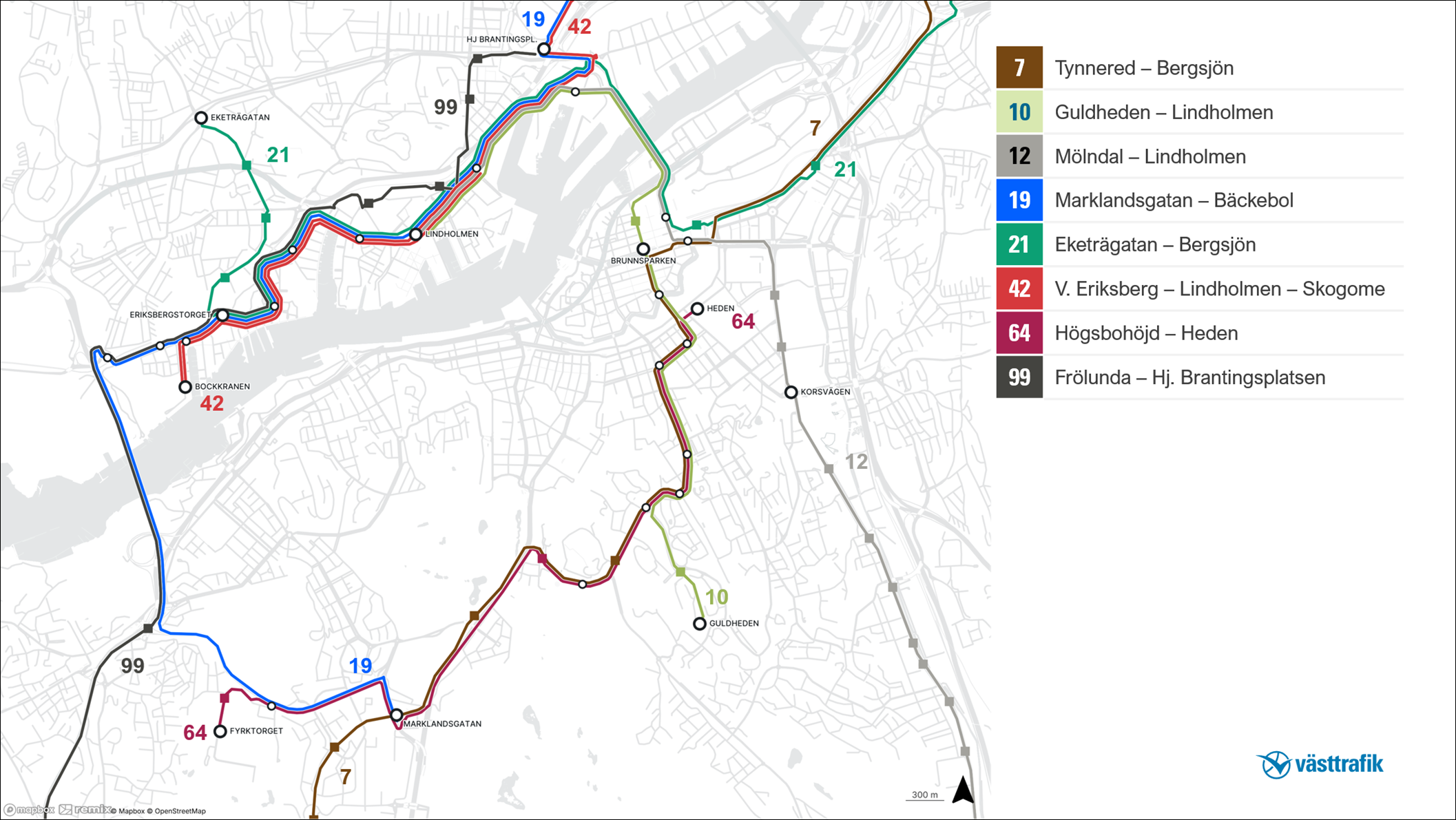 Linje 42 kommer köra mellan Bockkranen via Lindholmen till Pumpgatan. På Lindholmen kommer bussen stanna på samma hållplats som spårvagnslinjerna 10 och 12 vilket innebär ett smidigt byte. Varannan tur kör hela vägen till Skogome, via Hjalmar Brantingsplatsen för att skapa bytesmöjligheter även där. Linjen ska köra lika ofta från västra Eriksberg, under vissa tider på dygnet till och med oftare, än vad linje 16 gör idag.